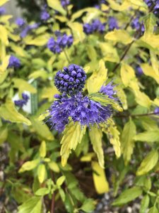 Dark blue flowers bloom late summer. Bright yellow foliage. Rounded habit. 3' tall/spread. Full Sun Z5