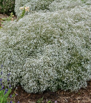 Small white semi-double slightly fragrant flowers cover a very densely branched rounded clump of gray-green foilage from late spring to summer. 23-27" tall x 30-40" spread. Full Sun Z3Stock