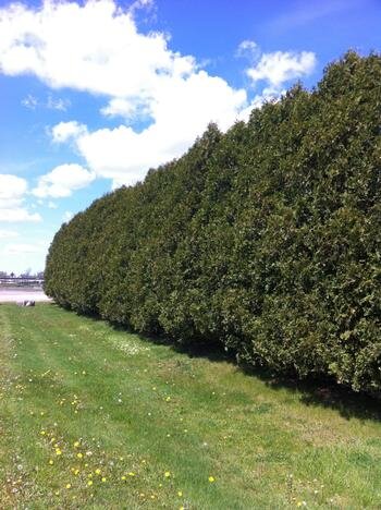 Zone: 3 Height: 10m Width: 2.5m Thuja occidentalis 'Nigra' Flattened sprays of dense, dark green foliage and an upright cone-shaped narrow form adds a vertical accent to the landscape either as a privacy screen, natural hedge, or fence.