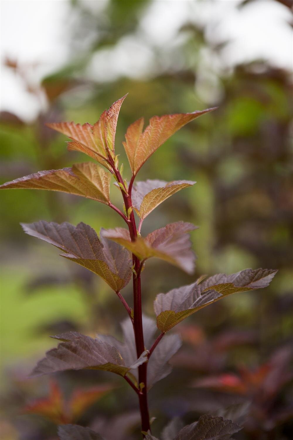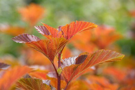 Showy orange foliage with yellow veins on new growth in spring/summer turns purple in fall. Small pinkish-white blooms in clusters emerge in spring. The exfoliating bark adds to winter landscape. Rounded dense habit. 5-6' tall x 3-4' spread. Full Sun Z4