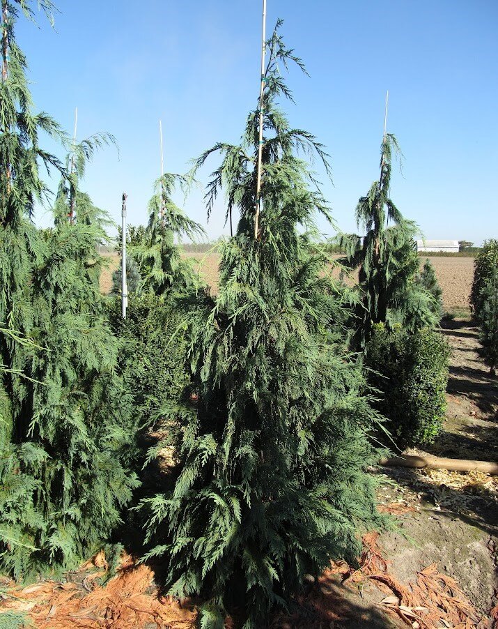 Zone: 4 Height: 9-12m Width: 3-4.5m Chamaecyparis nootkatensis 'Glauca' A tall, narrow evergreen with silvery-blue foliage, often used as an ornamental tree or for privacy screens in landscaping.Stock