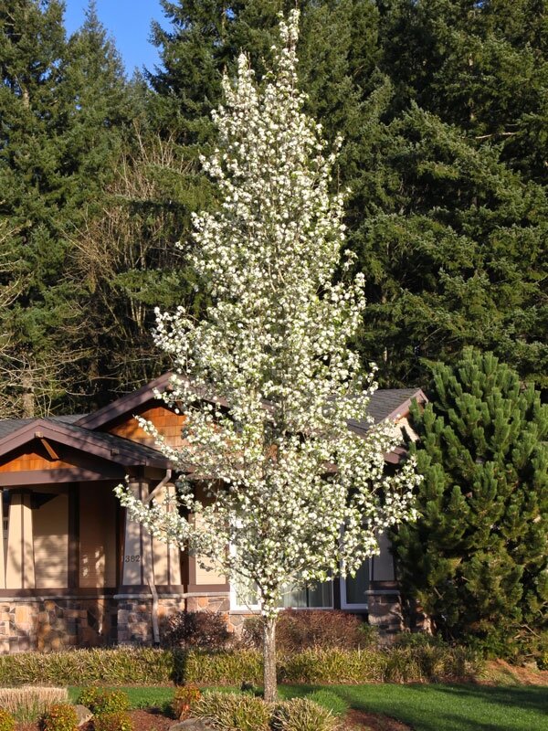 Zone: 5 Height: 13m Width: 5m Pyrus calleryana Chanticleer 'Glen's Form' More upright than 'Bradford', this tree is evenly branched, with an oval form, crisp green summer foliage, and a fall colour of reddish-purple. A good selection for formal or street tree plantings.Stock