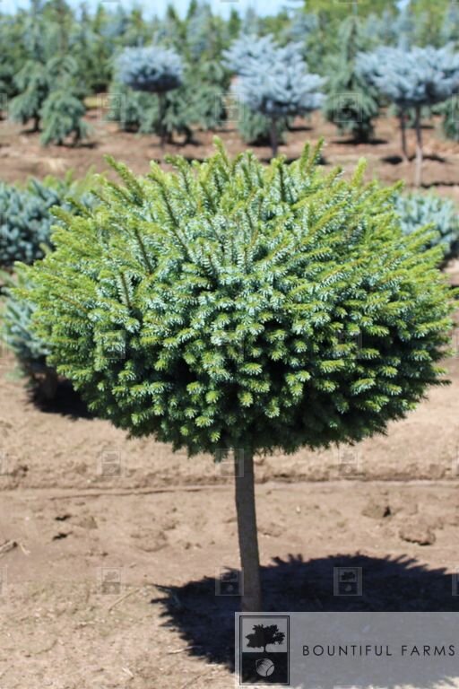 Zone: 4 Height: - Width: - Picea omorika 'Nana' (on standard) The Dwarf Serbian Spruce Standard features a small, rounded top of blue-green needles grafted onto a tall stem, creating an elegant, vertical accent perfect for gardens or decorative landscapes.Stock