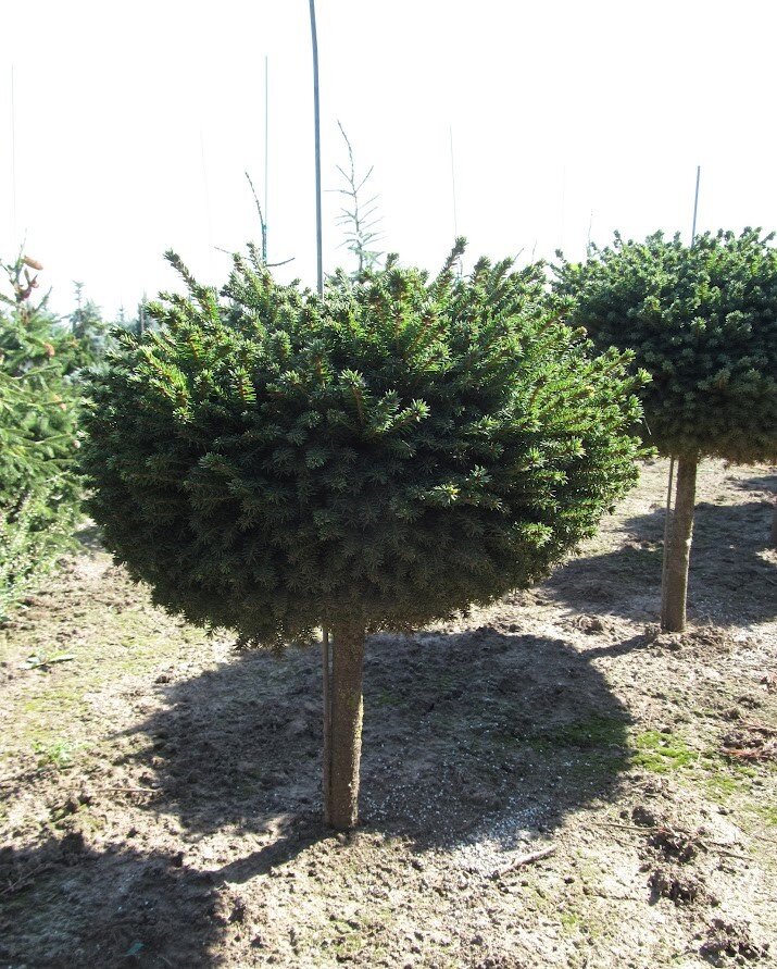 Zone: 3 Height: - Width: - Picea glauca 'Little Gem' (on standard) The Little Gem Spruce Standard features a compact, globe-shaped top of soft green needles grafted onto a tall stem, making it a charming ornamental tree for gardens and landscapes.