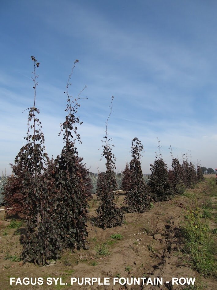 Zone: 5 Height: 9m Width: 5m Fagus sylvatica 'Purple Fountain' A narrow weeping purple beech with an upright growing top shoot and cascading branches. The rich, intense colour of the glossy purplish leaves makes an excellent specimen tree for the garden. Purple Fountain beech maintains a leader without staking.Stock
