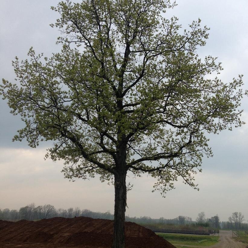 Zone: 4 Height: 25m Width: 17m Carya ovata; Easily recognizable by its light gray fissured bark that peels off in long curling strips. This hickory has a rounded crown, dark green glossy leaflets and bears rounded, edible nuts.